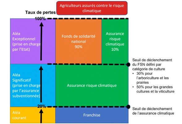 Synthèse entre un agriculteur assuré ou non et les partages de risques entre l’agriculteur, la compagnie d’assurance (si contrat) et l’état :