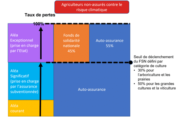 A noter, pour les agriculteurs non assurés, la part de prise en charge du FSN à hauteur de 45% en 2023 sera dégressive de 10% par an sur les deux années suivantes (soit 25% en 2025).