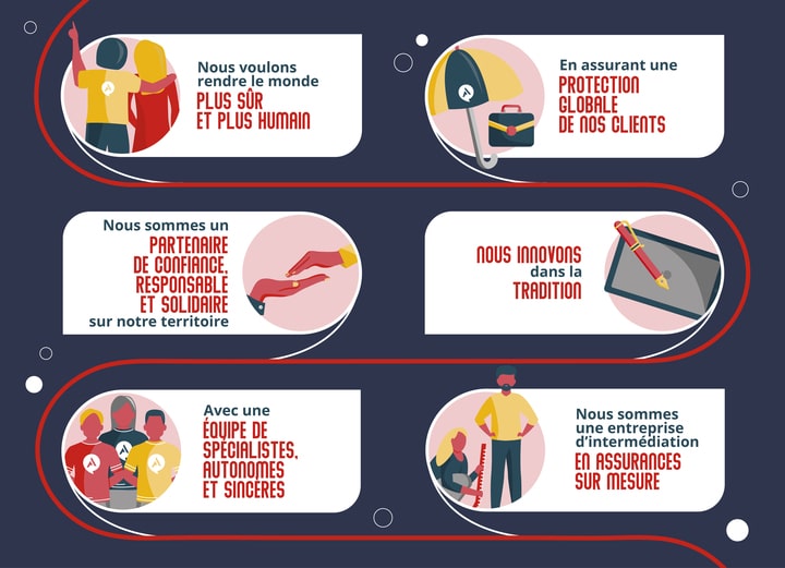 Présente dans le milieu de l’assurance depuis 1952, Assureurs Associés incarnent un certain nombre de valeurs qui forme sa raison d’être. Nous vous proposons donc de les découvrir par le biais de ce schéma :