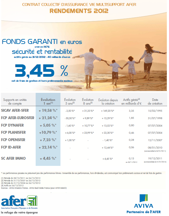 Le rendement 2012 du fonds garanti AFER est de 3.45% net de frais de gestion et hors prélèvements sociaux. L’AFER fait figure d’exception en proposant un taux 2012 supérieur au taux 2011 !